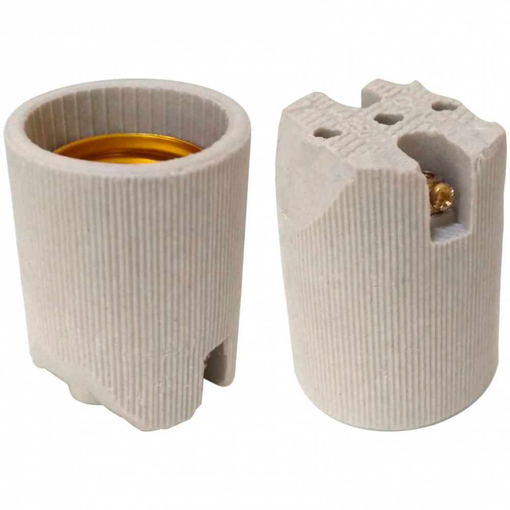 Soquete sem aba, em cerâmica com contatos em latão para Lâmpadas Base E27, halogenas, Fluorescentes e Led, muito utilizado em plafons, abajus, varal de luzes ou varal de lampadas entre outras aplicações.